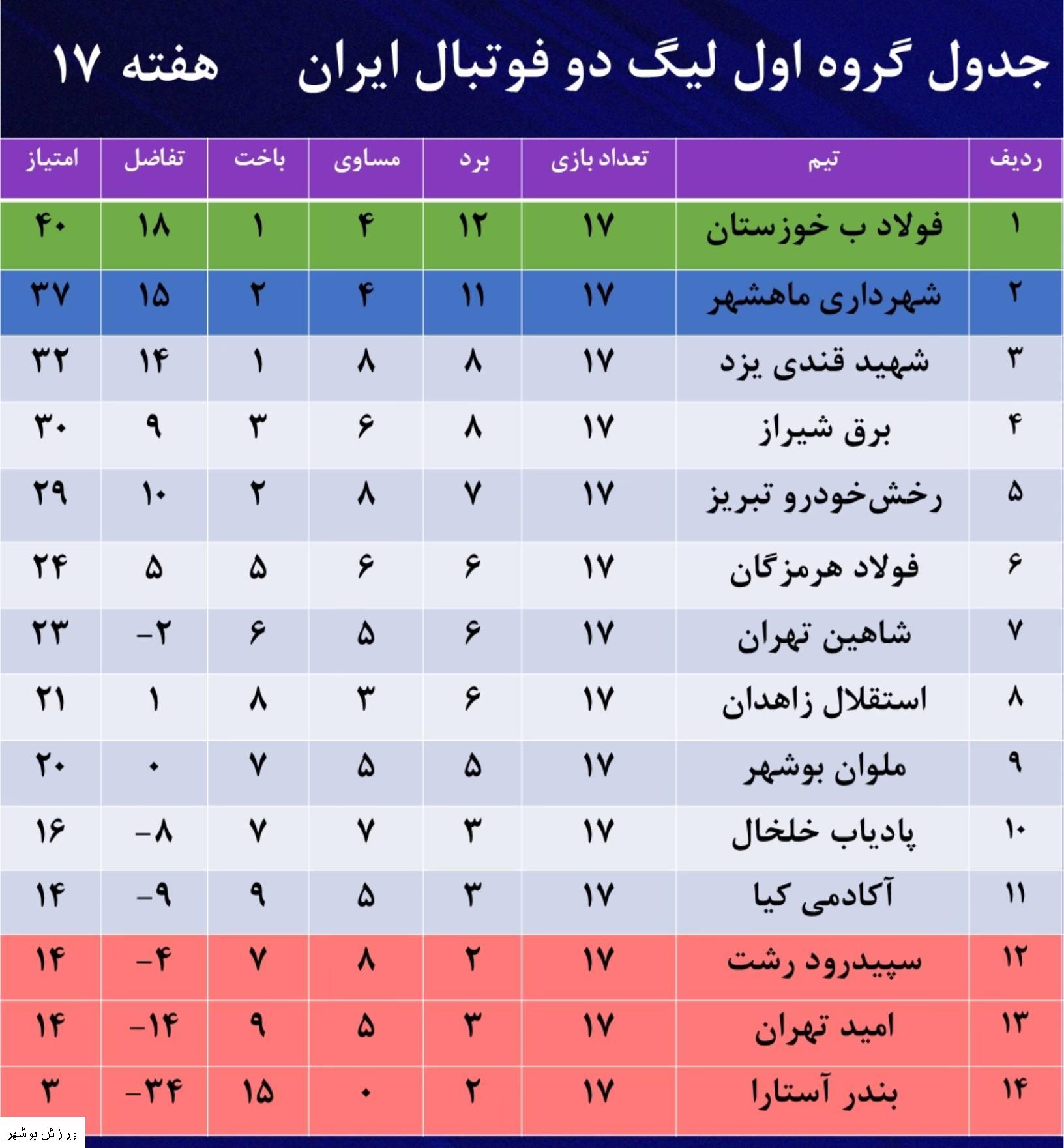 جدول لیگ دسته دوم کشور در پایان هفته هفدهم