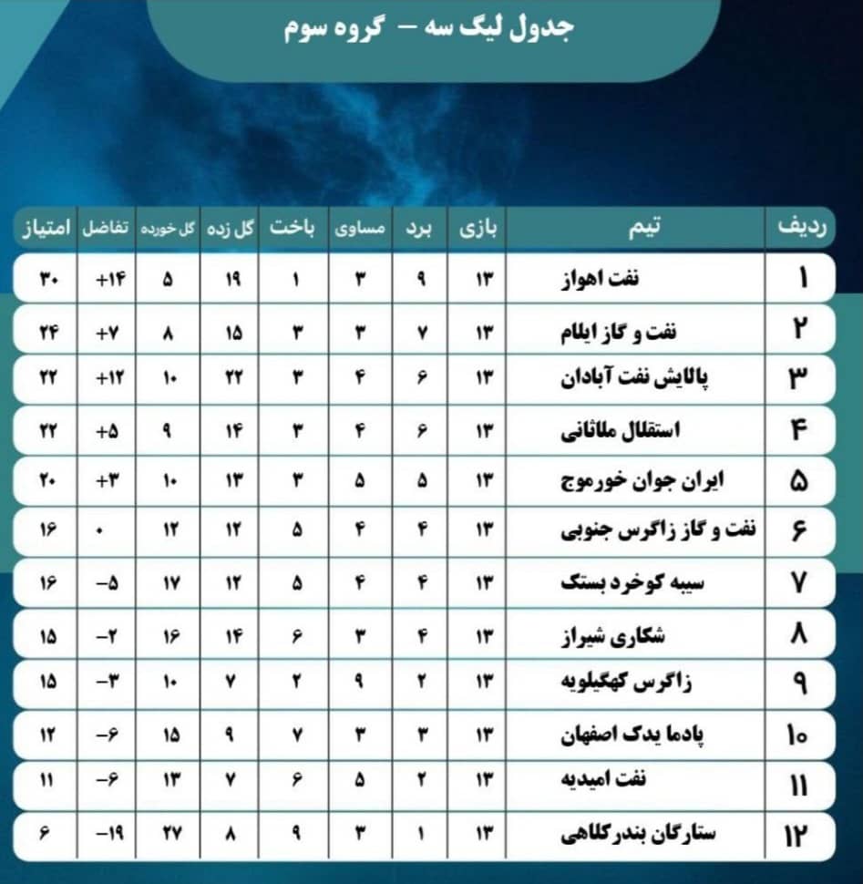 جدول گروه سوم لیگ سه کشور در پایان هفته ۱۳