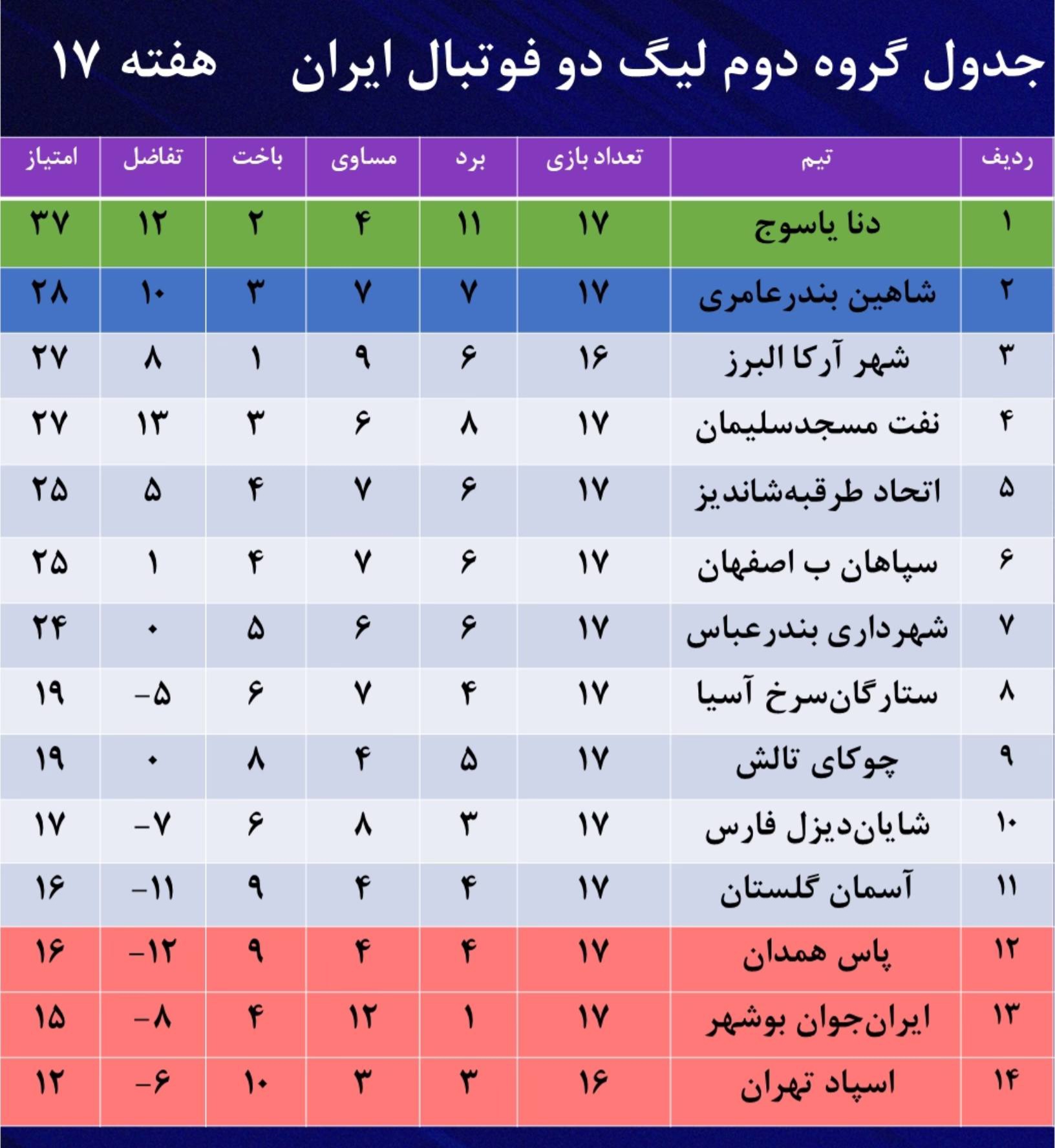جدول لیگ دسته دوم کشور در پایان هفته هفدهم