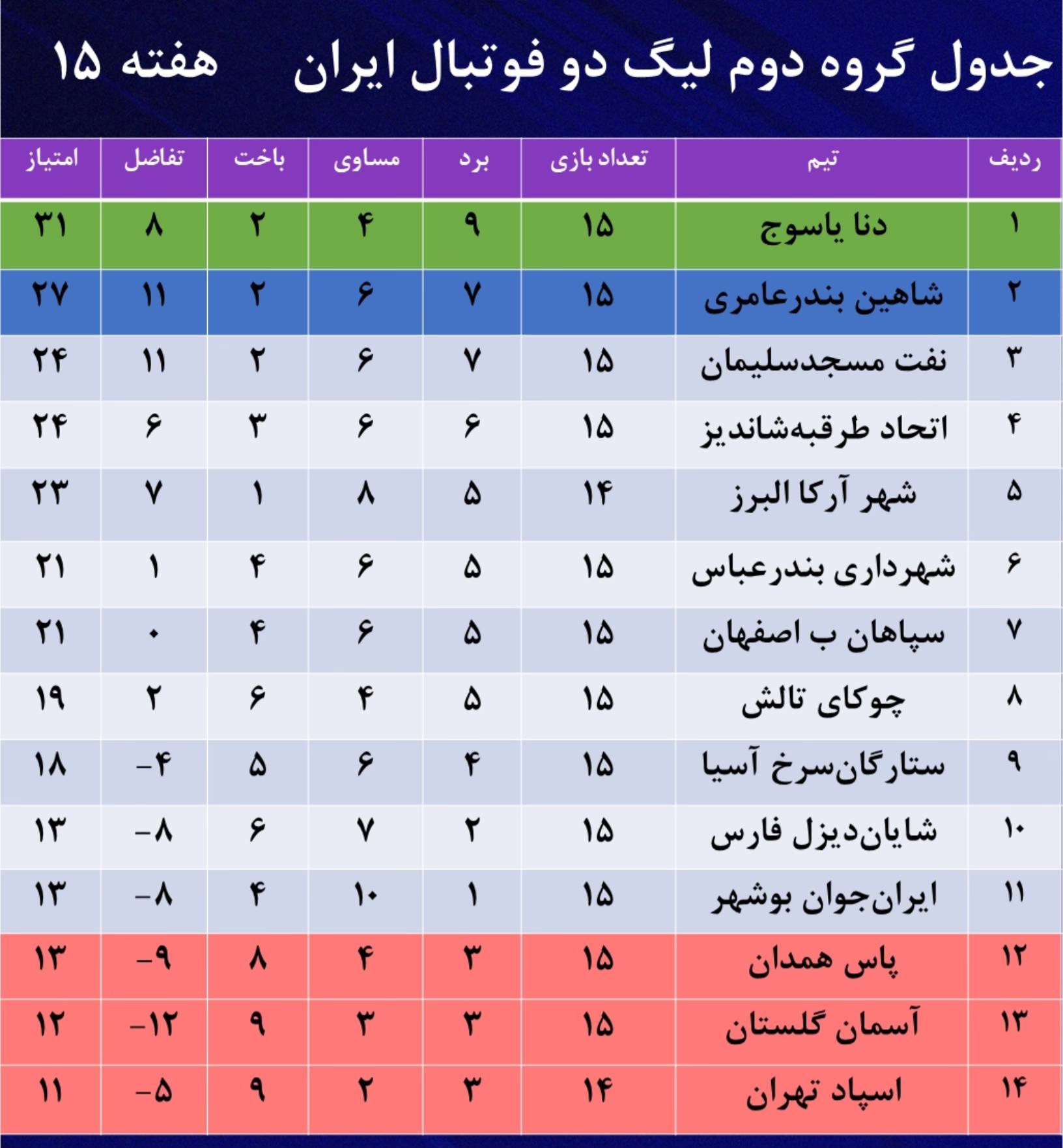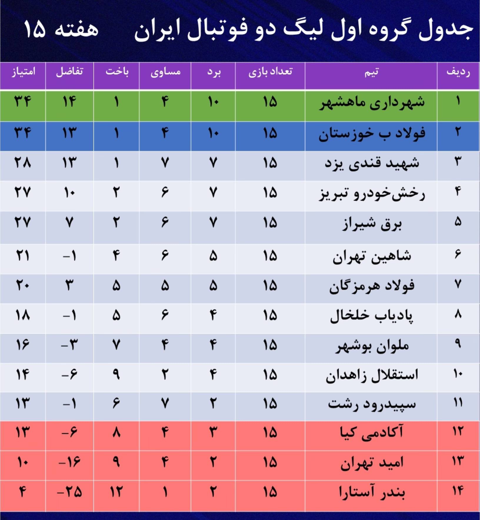 جدول گروه اول و دوم لیگ دو فوتبال کشور در پایان هفته ۱۵