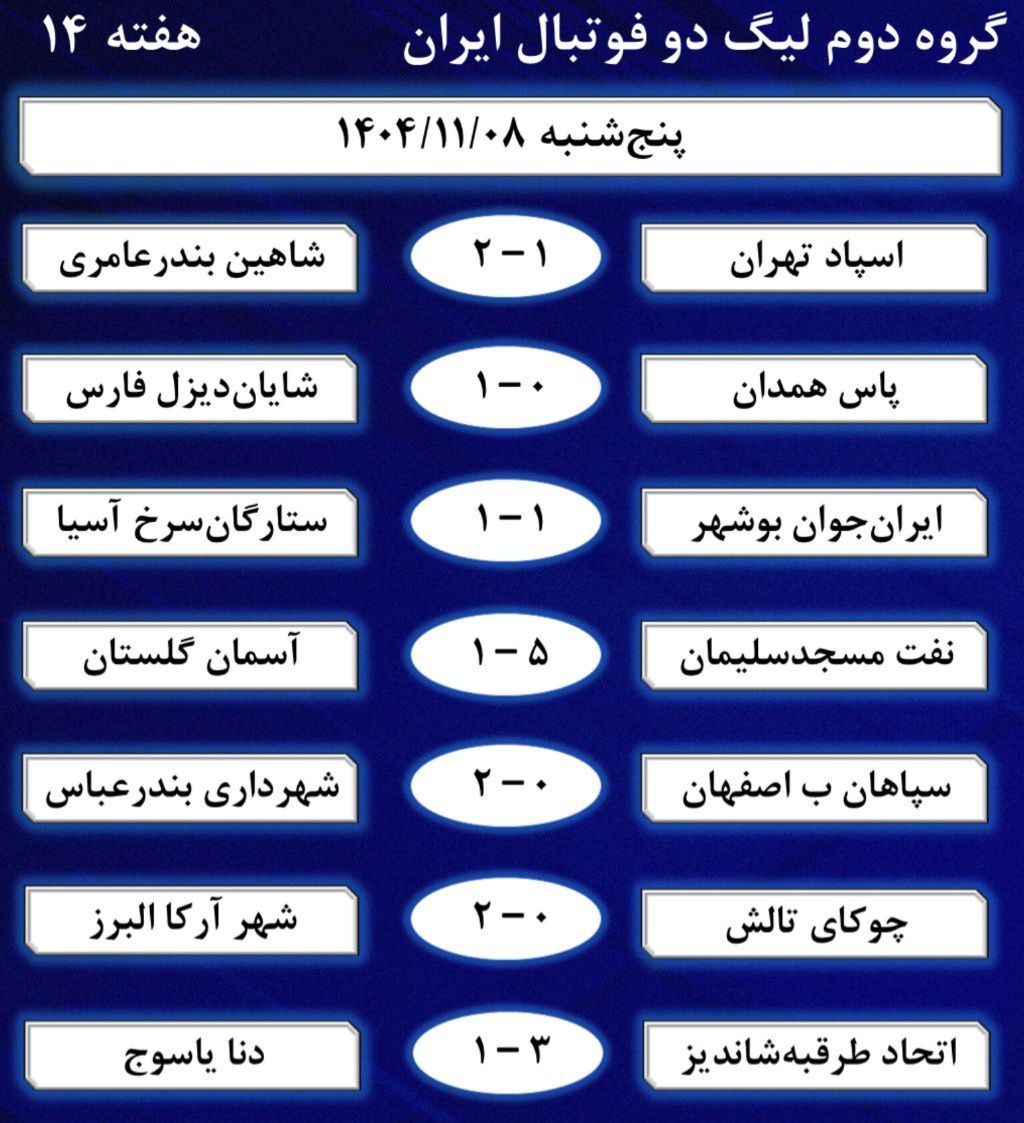 به گزارش "ورزش بوشهر"؛ جدول هفته ۱۴ لیگ دو فوتبال گروه دوم، رتبه‌بندی سه تیم آسمان، شایان‌دیزل و ایران‌جوان براساس بازی‌های رو در رو و سپس تفاضل است.